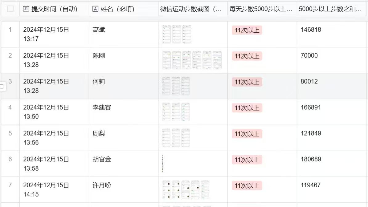 活动期间,教师每天通过在微信运动平台进行健步走打卡,记录步数并上传截图,该项活动不限时间和路线,每天健步走步数5000步以上,并且需要累计达到次数11次以上。